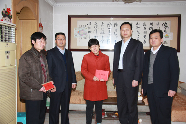一大早,李合军、王付清、刘岭一行就冒着料峭春寒驱车来到于秀娟家中,嘘寒问暖,详细了解疾病治疗情况和家庭生活状况,送去慰问品和慰问金,送去亲切的问候和诚挚的祝福,鼓励于秀娟战胜病魔,早日康复,勇度难关,享受幸福生活。于秀娟及家人一见到前来慰问的企业领导同志都感动得泪流满面,感激之情溢于言表。