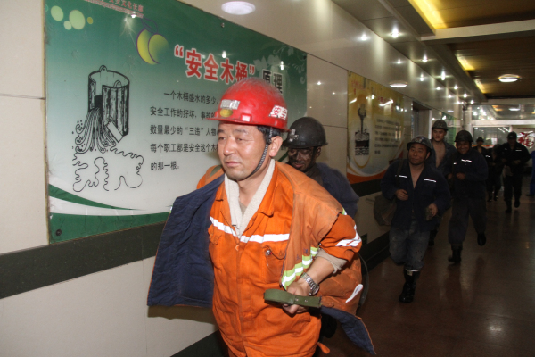 上午8时,演练正式开始。调度员接到8307三四分层工作面上端头向下15米处顶板出现溃水事故,水量急剧增大并危及现场人员人身安全的报告后,立即按十项应急处置权做出安排:立即停产撤人,并利用群呼系统和语音广播系统3分钟内通知到下井各作业地点和机台岗位,组织人员沿避水灾路线撤人。同时命令运输工区做好人员提升准备;命令井下中央泵房开启所有水泵、关闭防水闸门,命令中央变电所切断受水害威胁区域的电源。8:04,调度员立即向值班矿长、鲁泰煤业公司及市煤炭局调度值班领导汇报。接调度电话后,刘岭矿长迅速来到调度指挥中心,命令立即拉响警报并启动应急预案,成立以矿长为总指挥的应急救援指挥部。8:13,拉响警报,各救援小组3分钟内集结完毕。各小组组长3分钟内在调度指挥中心到齐后,总指挥刘岭矿长作出重要部署。各组人员立即按照要求迅速进入应急演练状态,严格按职责分工投入到抢险救援工作中。井下人员按照避灾路线陆续撤离,58分钟内全部升井。对未能按时升井的1人,立即组织紧急施救,确保人员全部安全撤离。演练现场,应急指挥部各成员单位反应迅速、通力配合,整个演练过程组织严密、紧张有序、指挥有力。9:30,受困人员成功安全升井。经现场施救后,送往医院。总指挥刘矿长宣布2013年应急预案演练圆满结束。